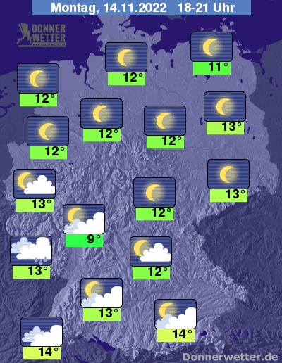 In der Nacht zum Dienstag bringen dichte Wolken vom Oberrhein bis zum Rheinland gebietsweise Regen. Vom Niederrhein bis ins Emsland ziehen auch mehr Wolken auf, wobei es hier weitgehend trocken bleibt. Im übrigen Land zeigt sich der Himmel verbreitet nur locker bewölkt oder sternenklar, dazu bleibt es trocken. Die Temperatur sinkt auf 11 Grad in der Kölner Bucht und bis etwa 3 Grad in Berchtesgaden.