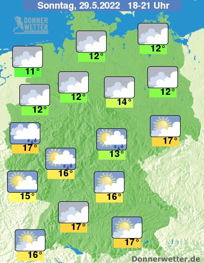 Heute Abend bleibt es über dem Norden weitgehend wolkenverhangen, jedoch trocken. Über der breiten Landesmitte ist es teils stark, teils aufgelockert bewölkt und es können sich noch einzelne Schauer bilden. Südlich des Mains ist es hingegen überwiegend heiter oder noch aufgelockert bewölkt und es bleibt trocken. Die Temperatur liegt bei 11 Grad in Cuxhaven und 17 Grad in München.