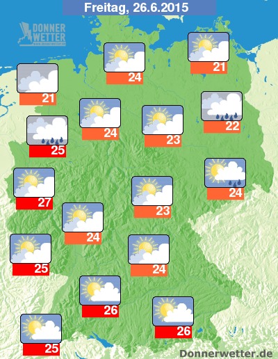 Heute ist es im Süden des Landes meist heiter bis sonnig und dabei trocken. Im Norden ist es dagegen oft stark und zum Teil aufgelockert bewölkt mit vereinzelten Schauern. In der breiten Mitte ist es größtenteils wechselnd und zeitweise auch stark bewölkt bei jedoch nur seltenen Schauern. Die Temperatur steigt auf 21 Grad in Rostock und bis 27 Grad in Köln.