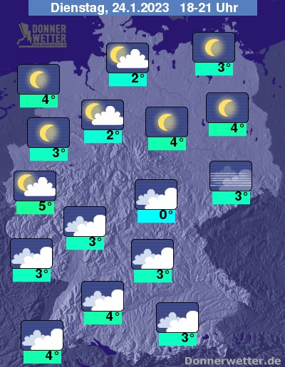 Heute Abend bleibt es über der Südhälfte weitgehend bedeckt und oft neblig-trüb, jedoch trocken. Weiter nach Norden hin zeigen sich zunehmend die Sterne und verbreitet ist es auch sternenklar, hier bleibt es ebenfalls trocken. Die Temperatur liegt bei 0 Grad in Jena und bis 5 Grad in Köln.