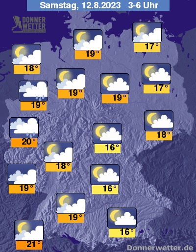 In der Nacht zum Samstag ziehen in einem breiten Band von NRW bis nach Schleswig-Holstein kompakte Wolken auf, dabei bilden sich gebietsweise Schauer. Weiter nach Südosten hin bleibt der Himmel dagegen aufgelockert bewölkt. Im Süden und Osten ist es zumeist nur locker bewölkt, dabei bleibt es trocken. Die Temperatur sinkt auf tropische 21 Grad in Freiburg und 16 Grad in Erfurt.