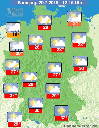 Heute Nachmittag bleibt es über der Südosthälfte des Landes noch oft heiter bis sonnig und dabei trocken. Im Nordwesten und anschließend auch im Norden und Westen ziehen dichte Wolken heran, dabei bilden sich zum Teil kräftige Schauer und Gewitter. Die Temperatur liegt bei teils nur 18 Grad an der Nordsee und bis 32 Grad in München.