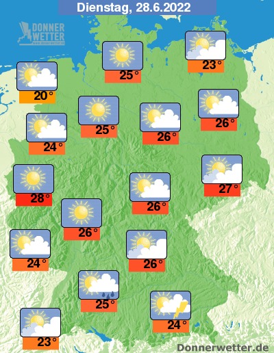 Heute bleibt es über dem Süden verbreitet stark, über Sachsen häufig stark bewölkt, dabei bleibt es aber zumeist trocken. In Alpennähe ist jedoch mit einzelnen Schauern und Gewittern zu rechnen. Im übrigen Land ist es verbreitet heiter bis sonnig und dazu trocken. Die Temperatur steigt auf 20 Grad an der Nordsee und bis 28 Grad in der Kölner Bucht.
