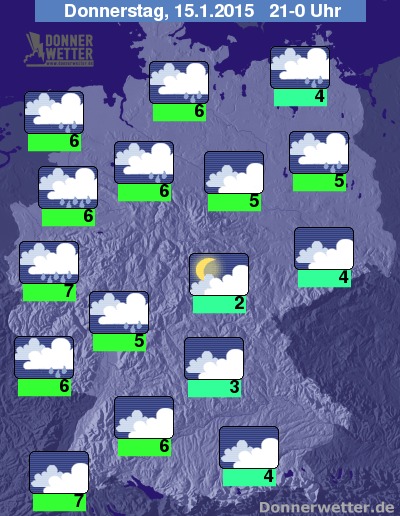 Heute Abend ziehen über die Nordwesthälfte des Landes dichte Wolken und es fällt teils kräftiger und langanhaltender Regen. Im Süden und Osten ist es stark oder dicht bewölkt, jedoch fällt hier nur selten etwas Regen. Die Abendwerte liegen bei 7 Grad in Bonn und bei 2 Grad im Grabfeld. Mit Ausnahme des Südens weht der Wind oft frisch bis stark und in Böen teils stürmisch. Auf den Hochlagen der Mittelgebirgen und an den Küsten ist es meist stürmisch, dabei sind schwere Sturmböen möglich.