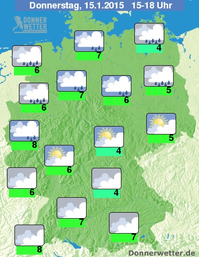 Heute Nachmittag bleibt die Wolkendecke verbreitet geschlossen, nur ganz vereinzelt kann es im Osten, im Süden und in der Mitte des Landes auch mal auflockern, hier bleibt es meist trocken, sonst fällt insbesondere im Norden aber häufiger und teils kräftiger Regen. Die Temperatur liegt bei 4 Grad an der Fränkischen Alb und bis 8 Grad in Aachen. Mit Ausnahme des Südens weht ein verbreitet frischer bis starker Wind mit möglichen Sturmböen, vereinzelt auch mit schweren Sturmböen. An den Küsten und auf den Bergen herrscht zum Teil Sturm mit teils orkanartigen Böen.
