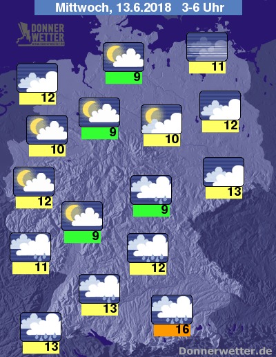 In der Nacht zum Mittwoch bilden sich im Süden weitere, teils kräftige Schauer und Gewitter, auch sonst ist es oft stark, gebietsweise aufgelockert bewölkt, dazu jedoch weitgehend trocken. Die Temperatur sinkt auf 16 Grad in Augsburg und bis 9 Grad an der Weser.