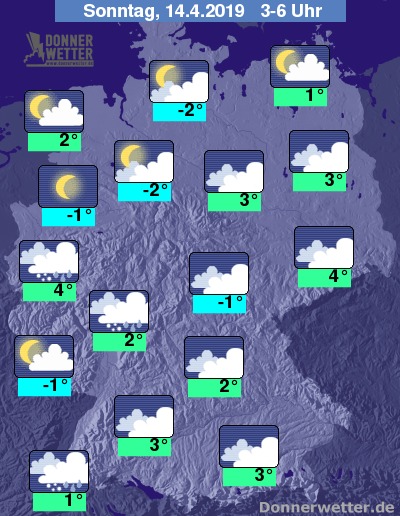 In der Nacht zum Sonntag lockert es im Norden und Nordwesten der Republik verbreitet auf, dazu bleibt es wie auch über der übrigen Nordosthälfte trocken. Häufig dichte Wolken bringen dem Süden und Westen dagegen gebietsweise Niederschläge in Form von Regen, Schneeregen, Schnee oder auch Graupel. Die Temperatur sinkt auf für die Jahreszeit kühle 4 Grad in Dresden und bis -2 Grad an der unteren Weser.