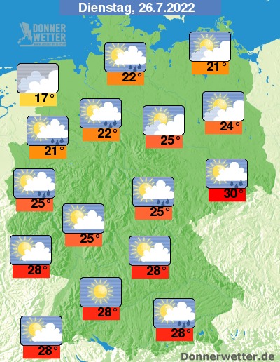 Am Dienstag ist es über der Nordhälfte oft stark bewölkt, teils zeigen sich auch Aufheiterungen, allerdings bilden sich gebietsweise Schauer. Im übrigen Land ist es heiter bis sonnig und zumeist trocken, an den Alpen bilden sich örtliche Schauer und Gewitter. Die Temperatur steigt auf frische 17 Grad an der Nordsee und bis 30 Grad in der Lausitz.