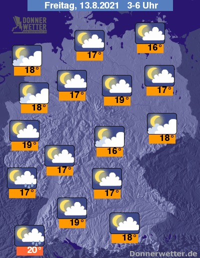 In der bevorstehenden Nacht zeigt sich der Himmel überwiegend locker oder aufgelockert bewölkt, hier und da ziehen jedoch auch dichte Wolken durch, dazu sind im Südwesten des Landes und im Nordseeumfeld vereinzelt Schauer möglich, sonst bleibt es weitgehend trocken. Die Temperatur sinkt auf tropische 20 Grad in Freiburg und bis 16 Grad in Neubrandenburg.