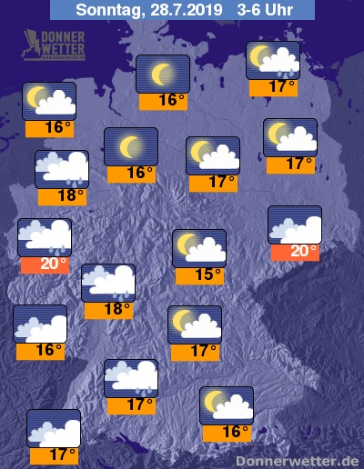 In der kommenden Nacht bilden sich über der Südwesthälfte des Landes vielerorts Schauer und auch lokale Gewitter, weiter nach Nordosten hin zeigt sich der Himmel meist locker bewölkt bis sternenklar, vereinzelt können aber auch hier dichte Wolken einzelne Schauer und Gewitter bringen. Die Temperatur sinkt auf 20 Grad in Bonn und bis 16 Grad in Kiel.