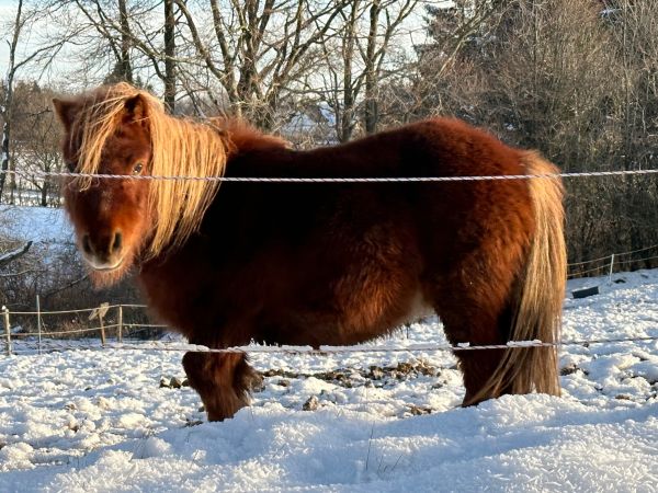 Nochmals steht das Pony im Wetterpark am Weißen Stein im Schnee.