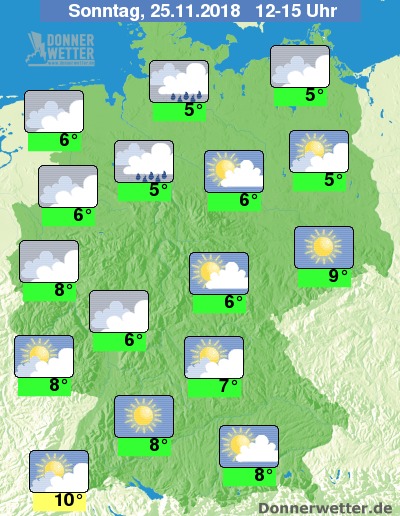 Heute Nachmittag scheint im Süden und Osten Deutschlands häufig die Sonne und es ziehen meist nur lockere Wolken durch. Über der Nordwesthälfte halten sich hingegen mehrheitlich dichte Wolken und Auflockerungen bleiben seltener, dazu fällt im Norden auch gebietsweise Regen. Im übrigen Land ist es weitgehend trocken. Die Temperatur liegt bei 5 Grad in Stralsund und etwa 10 Grad in Freiburg.