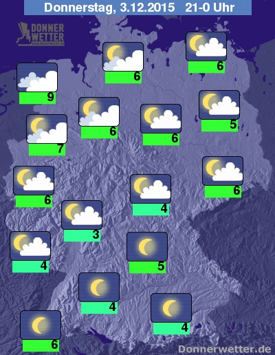 Heute Abend ist es im Norden und Westen teils aufgelockert, oft aber auch stark bewölkt. Im Osten und der Landesmitte zieht meist lockere bis aufgelockerte Bewölkung durch. Im Süden zeigt sich der Himmel hingegen verbreitet sternenklar. Es bleibt bundesweit trocken bei Abendtemperaturen von 9 Grad in Ostfriesland und etwa 3 Grad am Westerwald. An der Nordsee weht teils starker Wind.