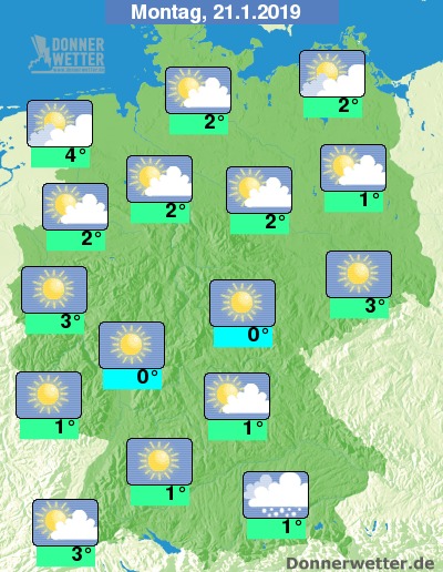 Heute zeigt sich das Wetter überwiegend heiter bis sonnig, über dem Norden und Nordosten, sowie über dem Voralpenland ist es allerdings oft stark bewölkt, dabei sind jedoch nur am Alpenrand auch einige Flocken möglich. Im übrigen Bundesgebiet bleibt es hingegen trocken. Die Temperatur steigt auf 0 Grad am Westerwald und bis 4 Grad in Wilhelmshaven.