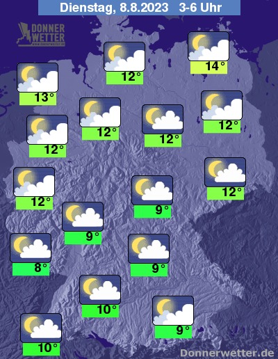 In der Nacht zum Dienstag ziehen im Norden und teils im Westen gebietsweise dichte Wolken durch, die einzelne Schauer bringen können. Im übrigen Land ist es überwiegend locker und sonst noch aufgelockert bewölkt, dazu bleibt es trocken. Die Temperatur sinkt auf 14 Grad in Rostock und 8 Grad in Saarbrücken.