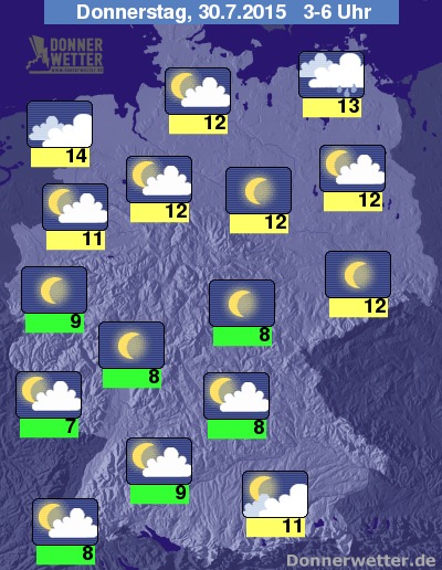 In der Nacht zum Donnerstag ziehen im äußeren Norden noch meist dichte Wolken durch, die für etwas Regen oder einzelne Schauer sorgen können. Am Alpenrand ist es oft stark bewölkt, aber weitgehend trocken. Im übrigen Bundesgebiet ist es hingegen überwiegend sternenklar, vor allem im Süden auch locker bewölkt und dabei trocken. Die Temperatur sinkt auf 14 Grad in Ostfriesland und bis 7 Grad am Pfälzer Wald.
