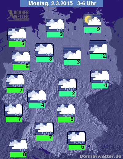 In der Nacht zum Montag bleibt es im Süden meist stark bewölkt bei gebietsweisem Regen, in den anderen Landesteilen ist es zunächst aufgelockert oder stark bewölkt und weitgehend trocken. Ab der zweiten Nachthälfte ziehen von Südwesten her dichte Wolken und teils kräftiger Regen auf, bis zum Morgen erreicht der Regen auch den Norden und Osten des Landes. Die Tiefstwerte liegen bei 8 Grad in Freiburg und bis 2 Grad an der Mecklenburger Seenplatte. Es weht verbreitet frischer und teils starker Wind, an den Küsten und auf den Hochlagen der Mittelgebirge weht der Wind teils stürmisch, dabei sind einzelne Sturmböen möglich.