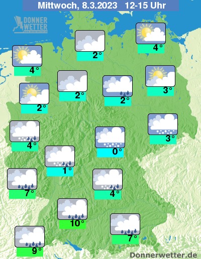 Heute Nachmittag zeigt sich das Wetter im Norden teilweise heiter, teils ziehen hier auch dichte Wolken durch, dabei sind vereinzelt Schneeschauer möglich. Im Rest der Republik zieht dichte Bewölkung durch und es fällt zeitweise Regen, Schneeregen oder Schnee. Im Süden fallen die Niederschläge weitgehend als Regen. Die Temperatur liegt bei 2 Grad in der Norddeutschen Tiefebene und bis 10 Grad im Raum Stuttgart.