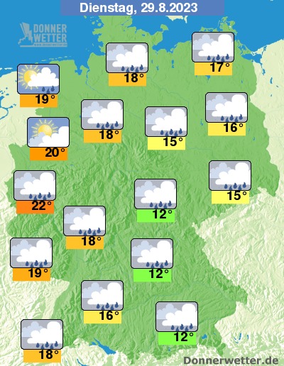 Heute zeigt sich das Wetter häufig stark bewölkt oder bedeckt, dabei bilden sich gebietsweise Schauer oder es fällt Regen. Im Nordwesten des Landes scheint auch öfter die Sonne, hier bleibt es meist trocken. Die Temperatur steigt auf kühle 12 Grad in Oberbayern und bis 22 Grad im Rheinland.