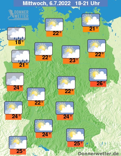 Heute Abend zieht sich der Himmel von Nordwesten her stetig weiter zu und vom Mittel- bis zum Niederrhein und zur Ems fällt gebietsweise Regen, sonst bleibt es trocken. Vor allem im Süden und Osten ist es noch oft locker bis aufgelockert bewölkt. Die Temperatur liegt bei kühlen 18 Grad in Wilhelmshaven und 26 Grad in Dresden.