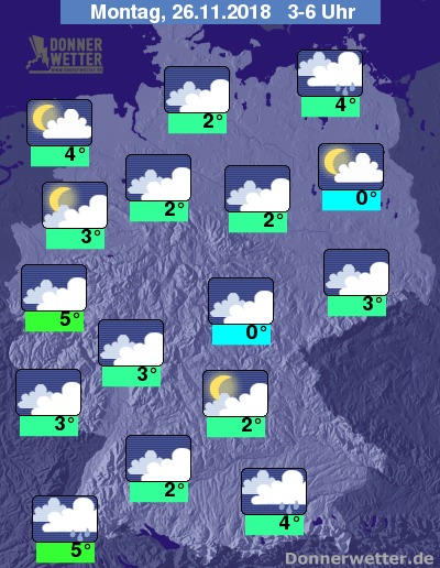 Am Montag zeigt sich das Wetter über dem Norden oft heiter bis sonnig, über der breiten Landesmitte ist es teils aufgelockert, teils aber auch stark bewölkt, dazu jedoch zumeist trocken. Im Alpenvorland halten sich dichte Wolken und es fällt zeitweise Schnee, Schneeregen oder Regen. Die Temperatur steigt auf 2 Grad im Vogtland und bis etwa 6 Grad im Oberrheingraben.