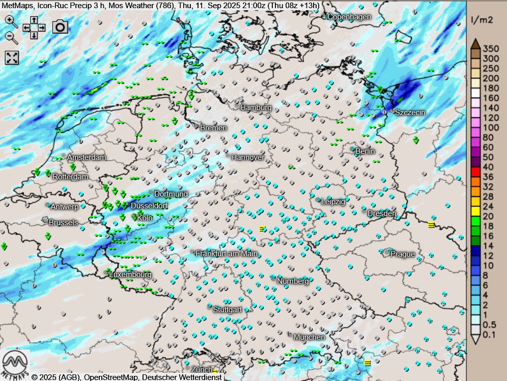 Die Wetterkarte mit den Drei-Stunden-Regenmengen bis 21:00 Uhr sowie die Lufttemperaturen in Deutschland nach ICON-RUC: