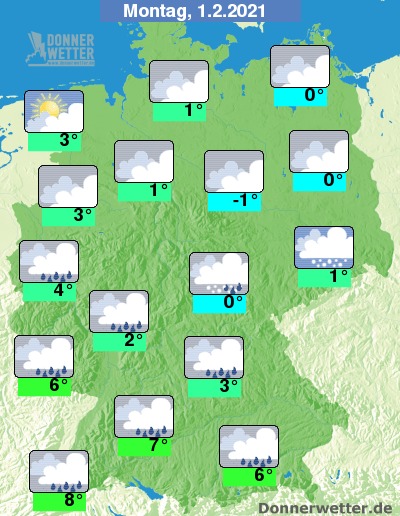 Am Montag bleibt es über der gesamten Südhälfte des Landes bedeckt und es fällt verbreitet Regen, Schneeregen oder Schnee. Im übrigen Bundesgebiet ist es meist stark, selten auch aufgelockert bewölkt, dabei bleibt es trocken. Die Temperatur steigt auf -1 Grad in Magdeburg und bis 8 Grad in Freiburg.