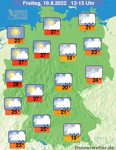 Heute Nachmittag ist es im Norden und Westen des Landes meist locker bis aufgelockert bewölkt und trocken. Im übrigen Bundesgebiet ziehen dagegen meist dichte Wolken durch und es können sich verbreitet Schauer und vor allem im Süden teils kräftige Gewitter bilden. Die Temperatur liegt bei 19 Grad in München und 28 Grad in Köln.