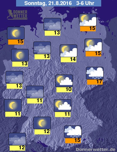 In der Nacht zum Sonntag fällt zunächst im Osten und Südosten noch verbreitet, teils kräftiger Regen, der im Südosten noch bis in die Morgenstunden fällt, im Osten am Morgen jedoch meist abklingt. Über den übrigen Landesteilen ist es hingegen größtenteils sternenklar und sonst locker bewölkt. Hier und da sind auch einige Wolken möglich, es bleibt aber weitgehend trocken. Die Temperatur sinkt auf 17 Grad in Görlitz und bis 10 Grad in Unterfranken.