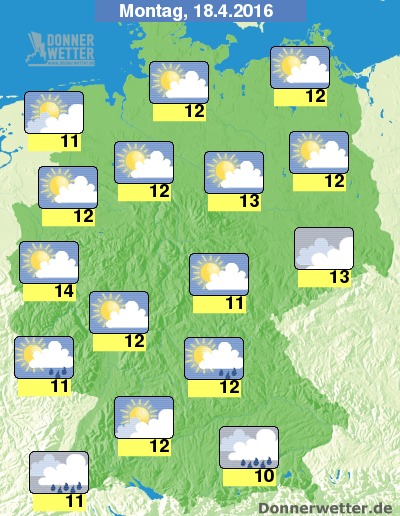 Am Montag halten sich im Süden weiterhin meist dichte Wolken und es fällt zeitweise Regen. Von Thüringen bis nach Sachsen ist es zwar oft stark bewölkt, dazu jedoch trocken. Im übrigen Bundesgebiet ist es größtenteils heiter bis sonnig, zum Teil ziehen aber auch einige Wolken durch, dabei bleibt es trocken. Die Temperatur steigt auf teils nur 9 Grad am Alpenrand und bis 14 Grad in Köln.