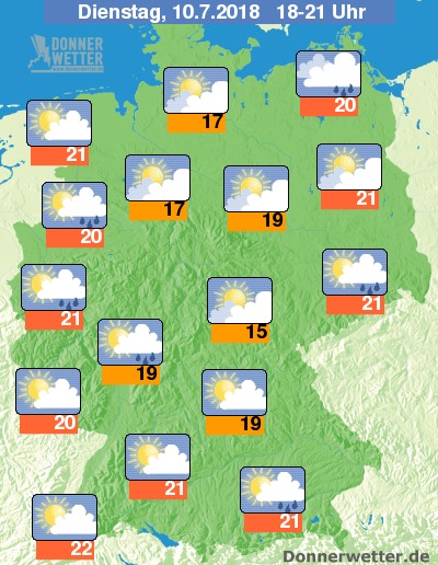 Heute Nachmittag ist es über dem Land meist stark und zum Teil aufgelockert bewölkt, dabei bilden sich im Süden und Nordwesten gebietsweise Schauer und mögliche Gewitter, auch im Norden sind einzelne Schauer möglich, sonst bleibt es weitgehend trocken. Die Temperatur liegt bei teils nur 13 Grad in Schleswig-Holstein und bis 22 Grad in München.