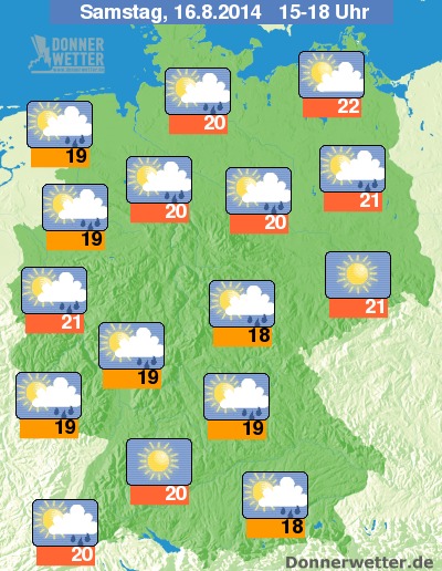Heute Nachmittag können sich wieder verbreitet Schauer, vereinzelt auch Gewitter bilden, dazwischen zeigt sich aber auch immer wieder mal die Sonne. Besonders in Sachen und in Süddeutschland ist es gebietsweise auch längere Zeit sonnig. Die Temperatur liegt bei 18 Grad am Thüringer Wald und etwa 22 Grad an der Ostsee.
