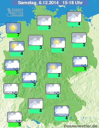 Heute Nachmittag fällt besonders im Stau der Nordalpen verbreitet Schnee, in tieferen Lagen auch Schneeregen und Regen, dabei kann es gefährlich glatt auf den Straßen werden. Auch in den anderen Landesteilen bleibt der Himmel überwiegend bedeckt und es fällt zeitweise etwas Regen oder Schneeregen, in den höheren Lagen auch Schnee. Am freundlichsten mit gelegentlichen Auflockerungen ist es einerseits von der Mitte des Landes bis nach Ostdeutschland und andererseits auch im Nordwesten des Landes, hier bleibt es weitgehend trocken. Die Temperatur liegt bei 2 Grad am Thüringer Schiefergebirge und bis etwa 7 Grad im nördlichen Emsland.