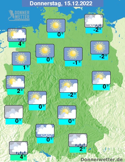 Heute scheint über der Nordhälfte Deutschlands verbreitet die Sonne. Im Küstenumfeld ziehen jedoch meist viele und oft dichte Wolken durch, die hier Schnee, Schneeregen und Regen bringen, sonst bleibt es trocken. Weiter nach Süden hin ist es dagegen bedeckt und die Sonne zeigt sich nur selten. Im Alpenvorland fällt Schnee, Schneeregen und teils gefährlicher gefrierender Regen, sonst bleibt es weitgehend trocken. Die Temperatur erreicht -2 Grad in Vorpommern und 4 Grad im Breisgau.