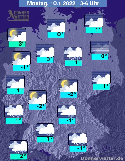 In der Nacht zum Montag ziehen kompakte Wolken über den Süden Deutschlands hinweg und bringen hier gebietsweise Schnee oder Regen. Im übrigen Land ist es teils stark, vor allem nach Westen hin auch häufiger aufgelockert bewölkt, dabei fallen nur selten ein paar Tropfen oder Flocken. Stellenweise bildet sich Nebel. Die Temperatur sinkt auf 3 Grad in Bremerhaven und bis -2 Grad in Erfurt.