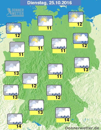 Heute zeigt sich das Wetter im Norden überwiegend heiter oder aufgelockert bewölkt und trocken, hier und da sind aber auch dichtere Wolken möglich. In den anderen Landesteilen bleibt es dagegen bei weitgehend dichten Wolken, dazu fällt im Süden und Osten zeitweise Regen, sonst bleibt es aber meist trocken. Die Temperatur steigt auf 11 Grad in der norddeutschen Tiefebene und bis 14 Grad im Breisgau.