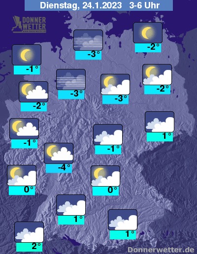 In der Nacht zum Dienstag zeigt sich der Himmel über Norddeutschland oft sternenklar oder gering bewölkt. Weiter nach Süden hin ist es dagegen zunehmend stark bewölkt oder neblig-trüb. Es bleibt weitgehend trocken bei Tiefstwerten von 2 Grad in Freiburg und etwa -4 Grad in Wiesbaden.