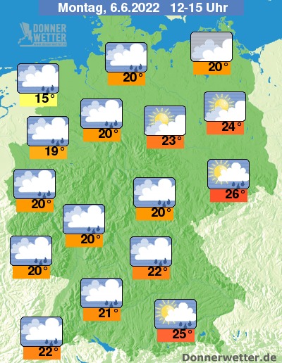 In den Nachmittagstunden zeigt sich der Himmel meist stark bewölkt oder bedeckt, gebietsweise Auflockerungen beschränken sich in den nächsten Stunden in erster Linie zunächst auf die Ost-, später die Südwesthälfte. Immer wieder muss am Montagnachmittag mit Schauern gerechnet werden.