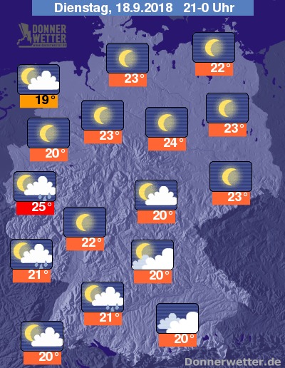 In der Nacht zeigt sich der Himmel über der Nordosthälfte zumeist sternenklar, in den übrigen Landesteilen überwiegt lockere oder aufgelockerte Bewölkung. Zwischen Mosel und Oberrhein sowie in der Altmark können in der Nacht regionale Schauer fallen, sonst bleibt es meist trocken.