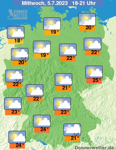 Heute Nachmittag zeigen sich zum Teil heitere Abschnitte, teils ziehen jedoch kompakte Wolken durch, dabei bilden sich vor allem im Nordwesten und Norden, sowie auch am Alpenrand einzelne Schauer, an den Alpen auch Gewitter. Im übrigen Land bleibt es meist trocken. Die Temperatur liegt bei 17 Grad an der Nordsee und bis 25 Grad an der Neiße.