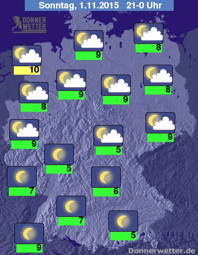 Heute Abend präsentiert sich der Süden Deutschlands weitgehend sternenklar. In den weiter nördlich liegenden Bundesländern ziehen dagegen oft lockere Wolken durch und gebietsweise ist es auch trüb oder hochnebelartig bewölkt, dazu bleibt es aber trocken. Die Abendtemperatur liegt bei 10 Grad in Ostfriesland und um 5 Grad in Franken.