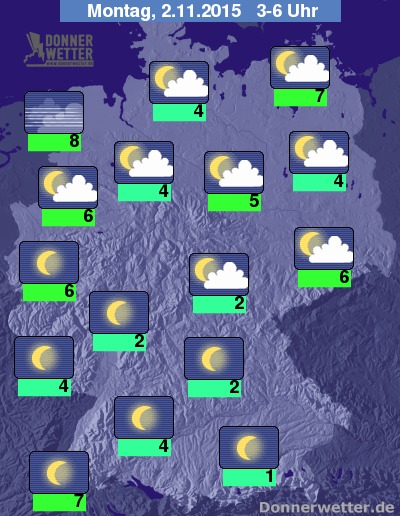 In der Nacht zum Montag ist der Himmel vor allem im Süden, aber auch im Westen der Republik verbreitet sternenklar. In den anderen Landesteilen zieht meist lockere Bewölkung durch, hier und da klart der Himmel aber ebenfalls auf, dazu bleibt es trocken. Die Temperatur sinkt auf 8 Grad an der Nordsee und bis 1 Grad im Chiemgau. Stellenweise bildet sich Nebel oder Hochnebel.