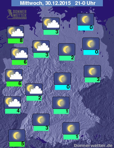 Heute Abend zeigt sich der Himmel über der Südosthälfte der Republik weitgehend sternenklar. Im Norden und Westen ziehen hingegen mehr oder weniger viele, jedoch weitgehend aufgelockerte Wolken durch, dabei bleibt es trocken. Die Abendtemperatur liegt bei 8 Grad an der Nordseeküste und um 0 Grad in Berlin. An den Küsten weht ein starker und teils auch stürmischer Wind.