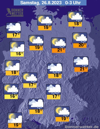 In der Nacht auf Samstag lockern die Wolken in der West- und Nordwesthälfte zunehmend auf und die Schauer klingen, ausgenommen das Nordseeküstenumfeld, weitgehend ab. In den übrigen Landesteilen bleibt der Himmel wechselnd oder stark bewölkt, dabei muss mit teils kräftigen Schauern und Gewittern gerechnet werden.