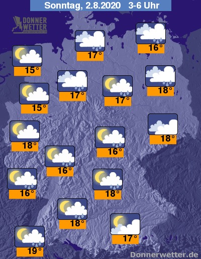 In der kommenden Nacht klingen die Schauer und Gewitter im Westen und Nordwesten Deutschlands wieder ab und es lockert oft etwas auf. Im übrigen Land ist es oft dicht, hier und da aufgelockert bewölkt, dazu bilden sich gebietsweise Schauer, örtlich auch Gewitter. Die Temperatur sinkt auf 19 Grad in Freiburg und bis 15 Grad an der Ems.