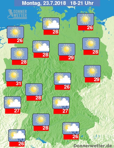 Heute Abend besteht über Bayern und dem südlichen Baden-Württemberg noch ein leichtes bis mäßiges Schauer- und Gewitterrisiko. Im übrigen Bundesgebiet ist es dagegen verbreitet heiter bis sonnig und dabei trocken. Die Temperatur liegt bei rund 26 Grad entlang der deutschen Küsten und bis 31 Grad in Köln.