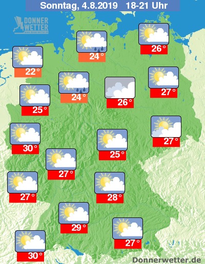 Heute Abend ist es weiterhin meist heiter und nur regional halten auch mal dichte Wolken, die jedoch nur sehr selten für Schauer oder noch seltener für Gewitter sorgen können. Die Temperatur liegt bei 22 Grad in Cuxhaven und bis zu 30 Grad in Freiburg.