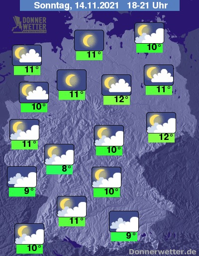 In der Nacht zum Montag hält sich im Süden noch oft dichte Bewölkung oder es ist hier neblig-trüb. Vor allem über der Nordhälfte des Landes ist es verbreitet gering bewölkt oder sternenklar, jedoch kann sich stellenweise Nebel oder Hochnebel bilden. Es bleibt überall trocken bei Tiefstwerten von 8 Grad in Freiburg und etwa 2 Grad in Hamburg.
