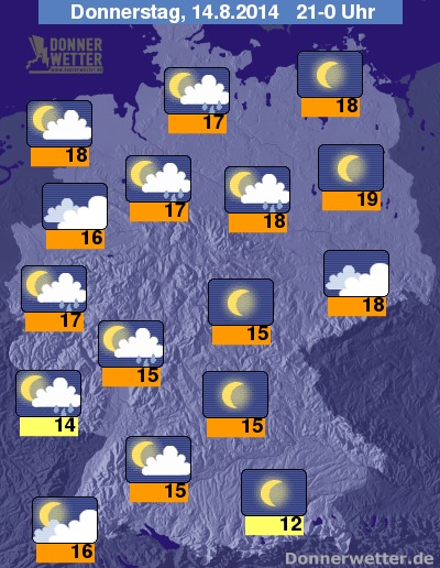 Heute Abend ist es in der Westhälfte meist aufgelockert, gebietsweise aber auch stark bewölkt mit möglichen Schauern, in der Osthälfte ist der Himmel dagegen häufig klar oder nur gering bewölkt, hier bilden sich nur selten Schauer. Die Abendtemperatur liegt bei eher herbstlichen Werten zwischen 19 Grad in Berlin und örtlich 12 Grad am Alpenrand.