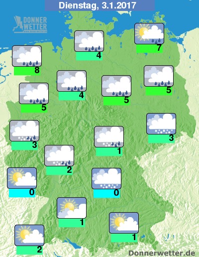 Am Dienstag setzt sich das nasskalte Frühwinterwetter meist fort, nur im Süden und Südwesten zeigt sich überwiegend die Sonne und es herrscht hier weitgehend trockenes Wetter vor, im übrigen Bundesgebiet halten sich jedoch dichte Wolken und es fällt zeitweise Regen, vor allem über dem Osten bis zur Mitte des Landes oft Schnee oder Schneeregen, dabei besteht Glättegefahr! Die Temperatur steigt auf 0 bis 8 Grad.